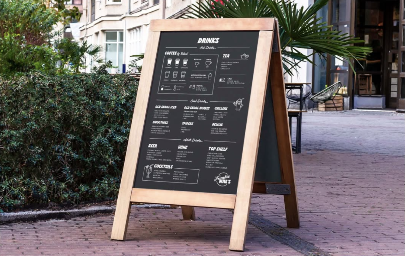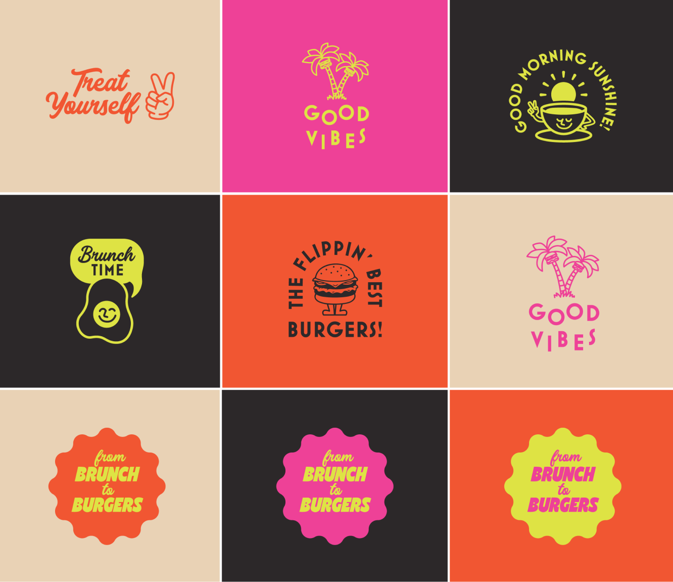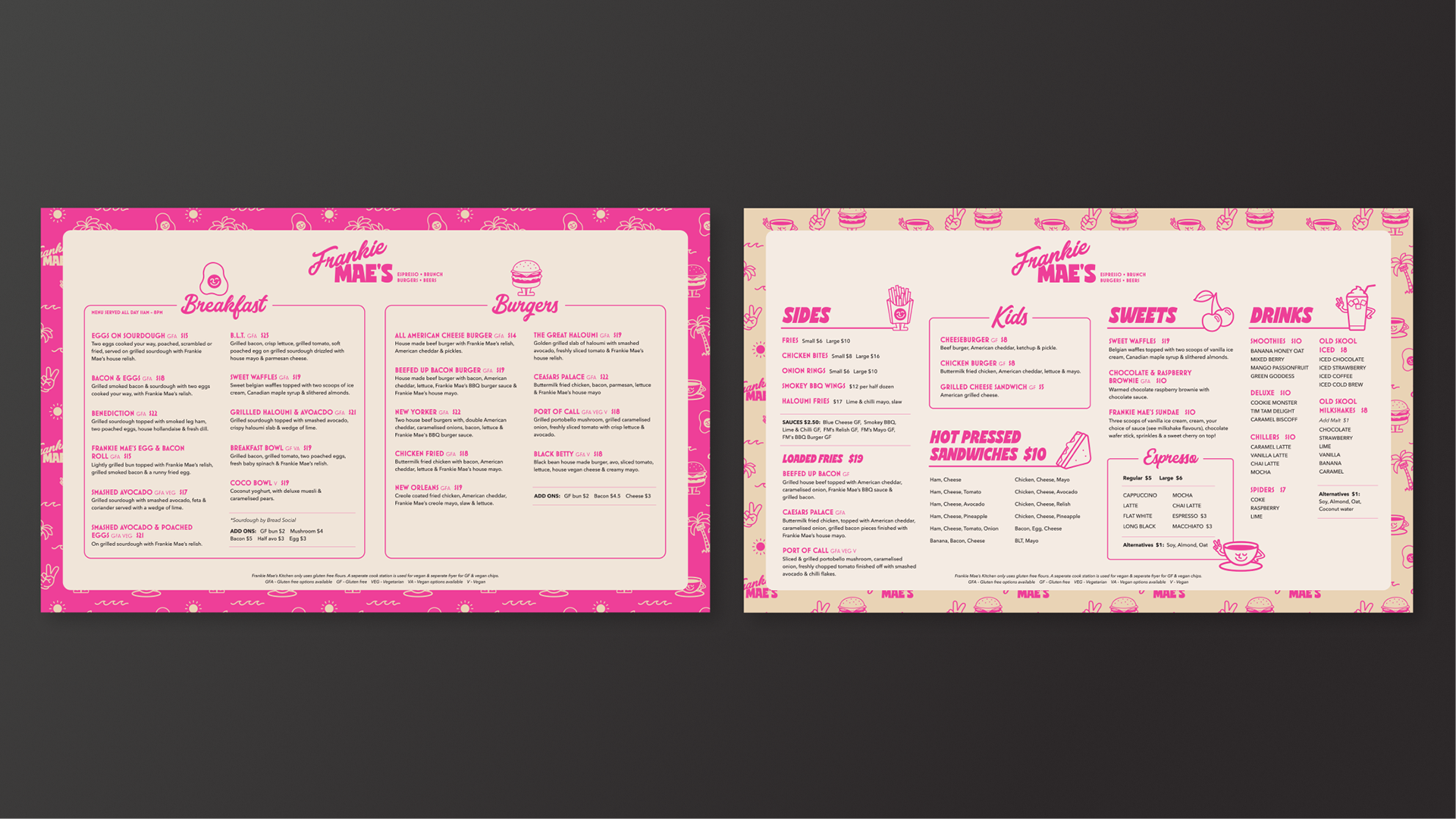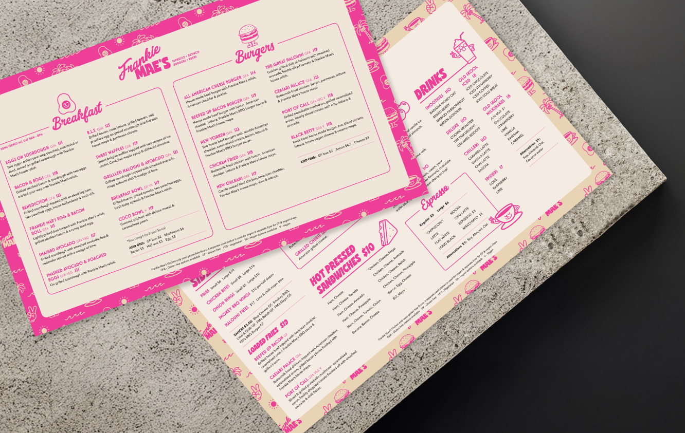 A variety of branding collateral for a cafe burger bar. The client wanted to fuse traditional service values with a fresh, modern aesthetic, taking inspiration from 80's diners and class burger joints.